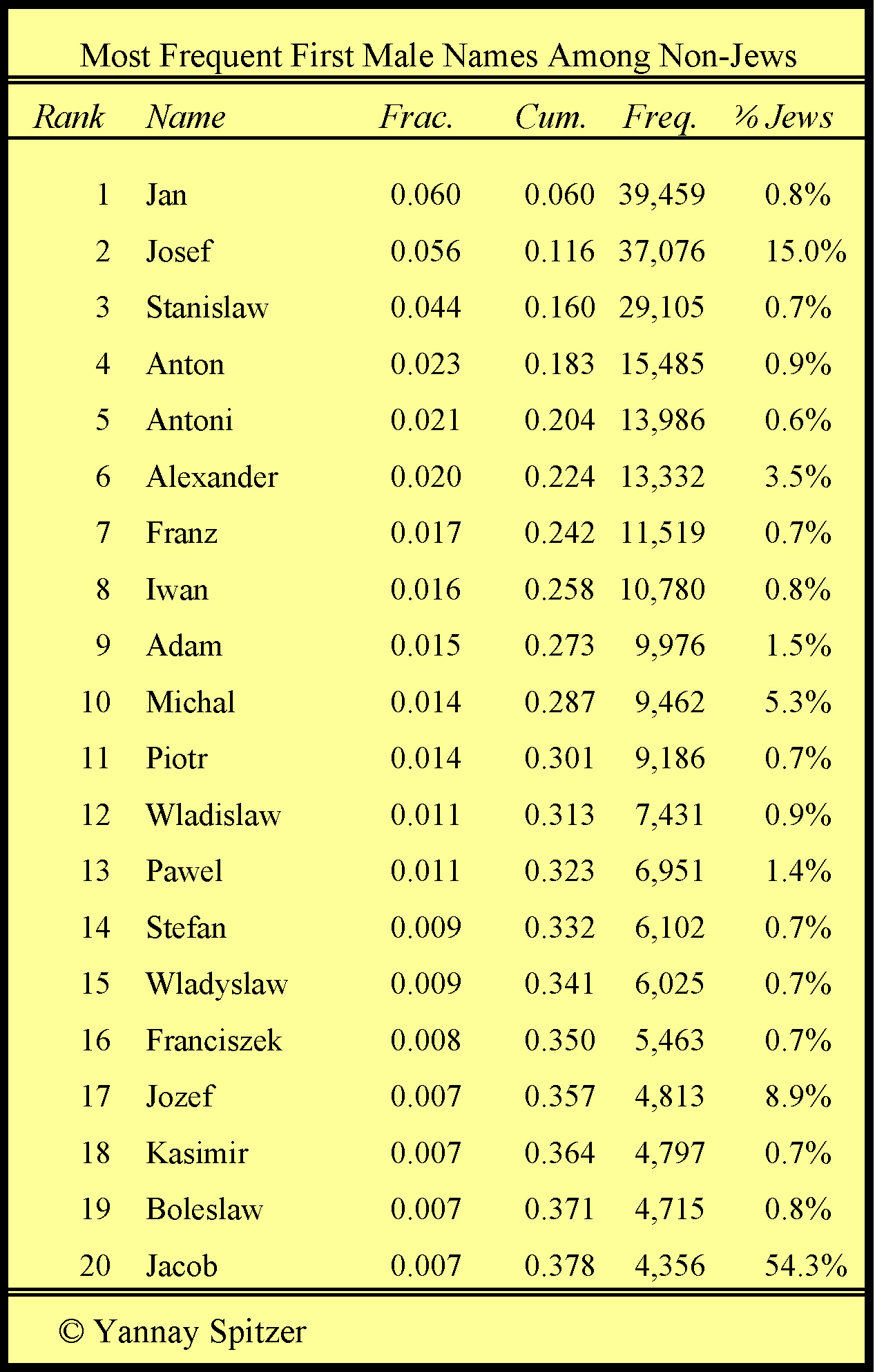 Third, common non-Jewish names were very common, even more so than among Jews: the top 20 names cover almost 38 percent of the total population of males that were not identified as Jews.