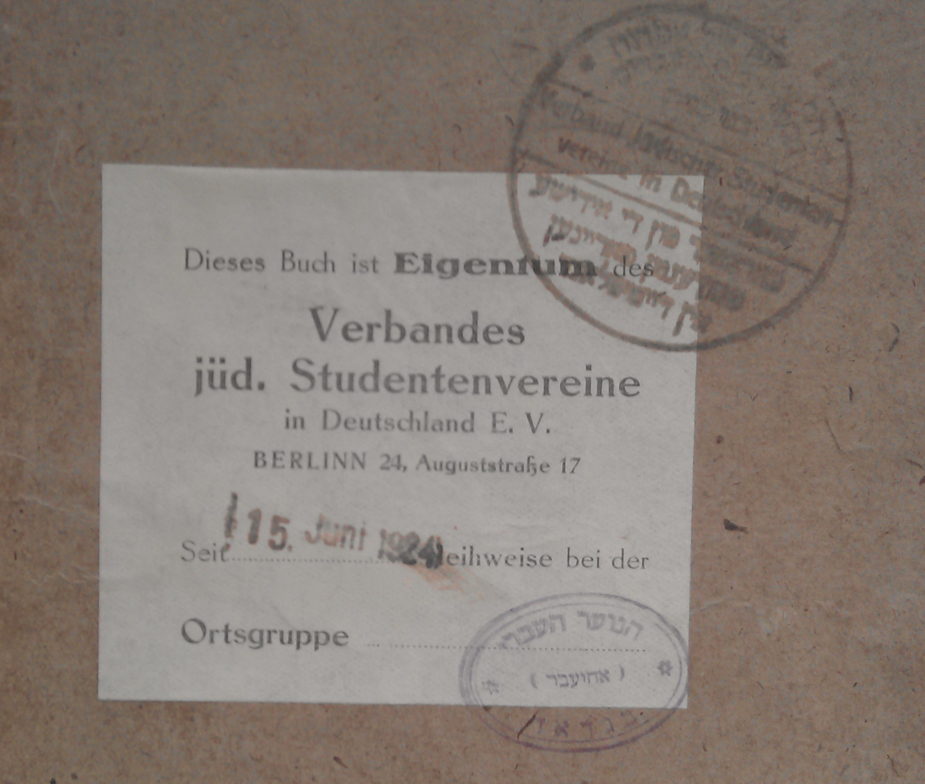 The stamps on the book testify to a peculiar journey it must have traveled. It belonged to two different libraries. One, of the Association of Jewish Student Clubs in Germany (Verband Jüdischer Studentenvereine in Deutschland), whose head office was in Berlin. The date on the stamp is June 15, 1924.